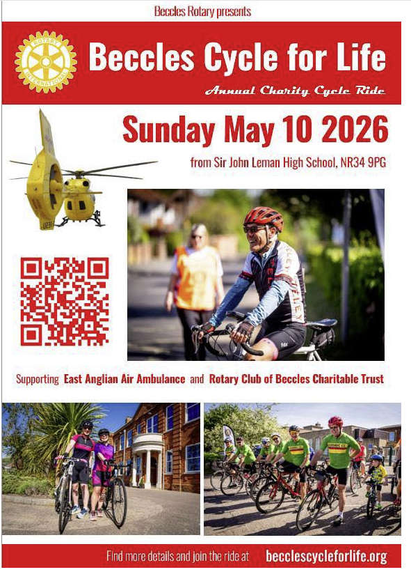 Beccles Rotary presents Beccles Cycle for Life - an annual charity cycle ride on roads through beautiful countryside from Beccles, Suffolk. The event raises funds for East Anglian Air Ambulance (Reg. Charity No.1083876) and the Beccles Rotary charitable trust (Reg. Charity No.1100871) with a 50/50 split of profits.